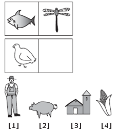 | A fish is to a dragonfly as a chicken is to corn. Fish eat insects; chickens eat corn. |