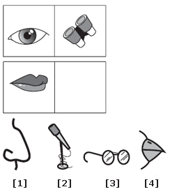 | An eye is to a pair of binoculars as a mouth is to a microphone. This relationship shows magnification. The binoculars help one see farther. The microphone helps one speak louder. |
