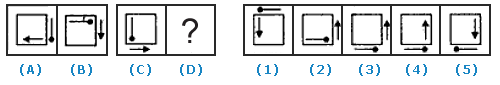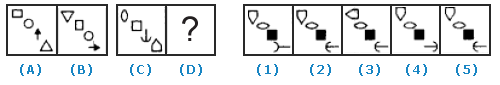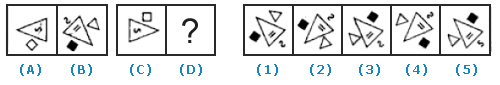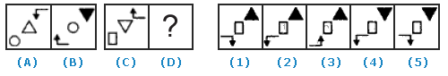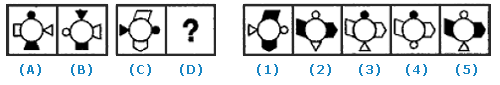 Each of the following questions consists of two sets of figures. Figures A, B, C and D constitute the Problem Set while figures 1, 2, 3, 4 and 5 constitute the Answer Set. There is a definite relationship between figures A and B. Establish a similar relationship between figures C and D by selecting a suitable figure from the Answer Set that would replace the question mark (?) in fig. (D).