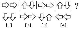 | Look at each segment. In the first segment, the arrows are both pointing to the right. In the second segment, the first arrow is up and the second is down. The third segment repeats the first segment. In the fourth segment, the arrows are up and then down. Because this is an alternating series, the two arrows pointing right will be repeated, so option b is the only possible choice. |